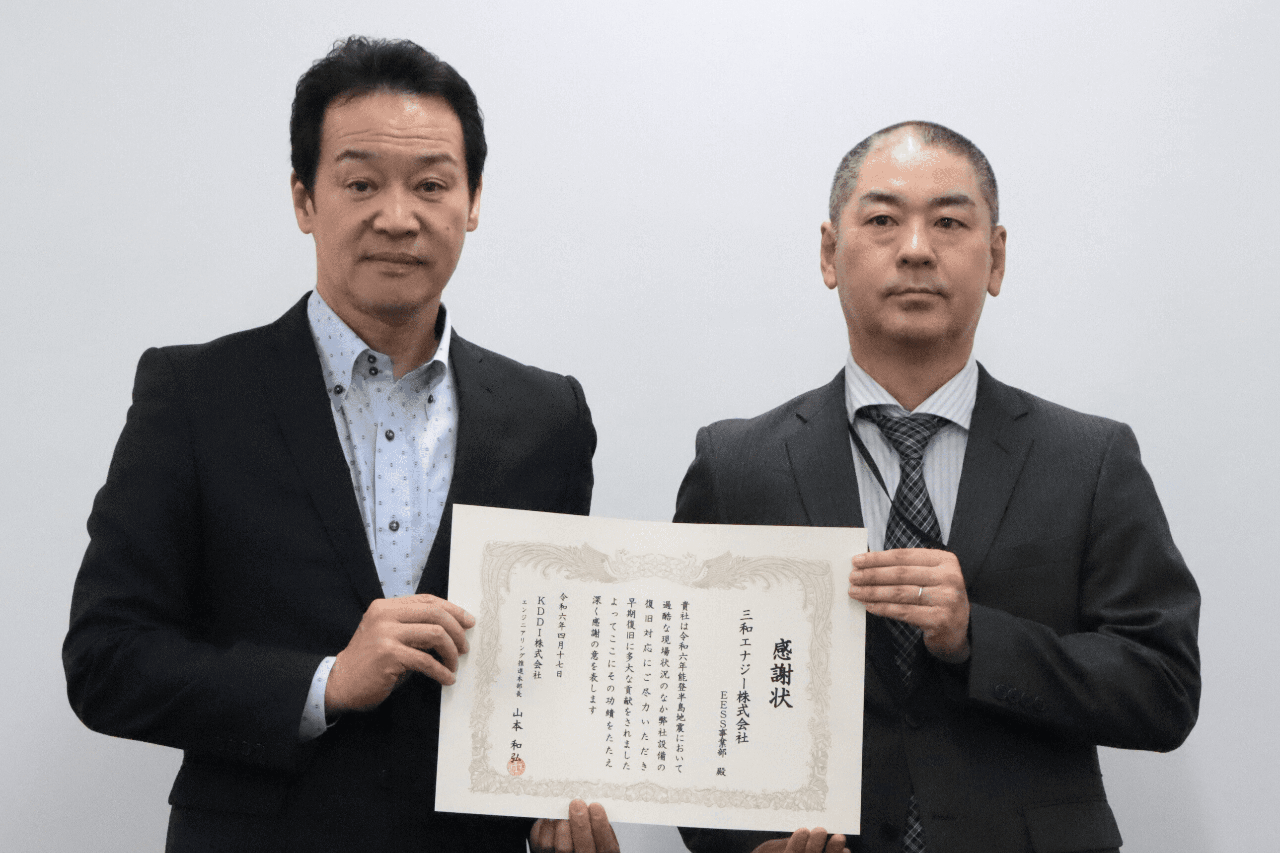 厳しい現場状況の中での復旧作業支援が評価され、令和6年5月17日(金) KDDI株式会社コア技術統括本部エンジニアリング推進本部 東日本運用センター統括Gグループリーダー 熊澤様より感謝状を賜りました。