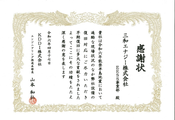 「令和6年能登半島地震」の災害対応により、KDDI株式会社様から感謝状をいただきました