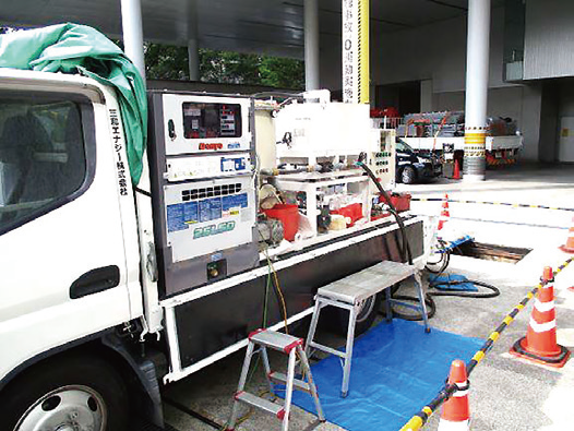 このようにライニングをしづらい古いタンクには、ロカクリーン®によるタンク内洗浄が効果的です。ロカクリーン®とは、三和エナジーが開発した移動式A重油循環ろ過システムで、専用車両に搭載された循環装置により、タンク内の燃料をろ過し、再びタンク内に戻します。